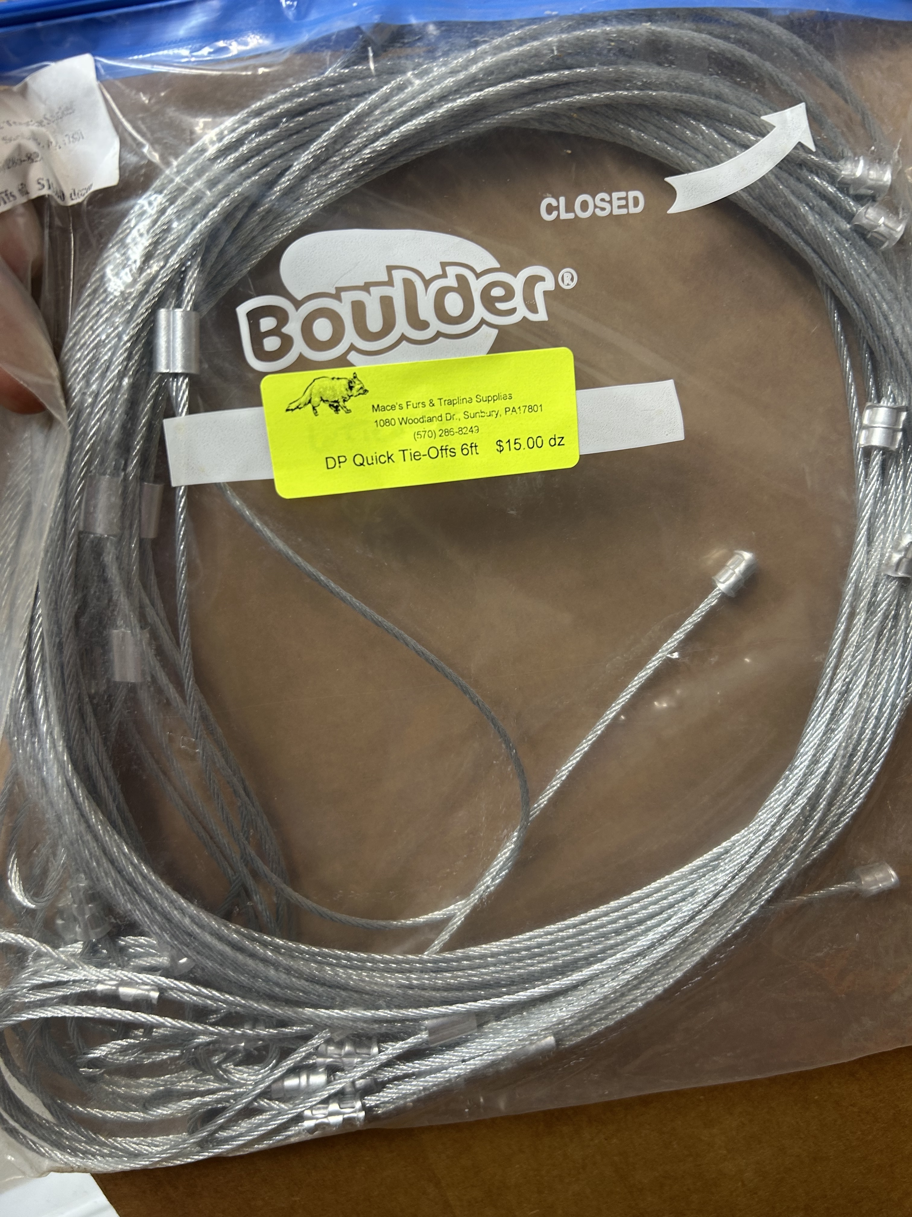 These are made with 3/32 7x7 galvanized aircraft cable. These are used for securing your trap or snare to a tree or post. You can use either a Quick link or crimp an S-Hook to the end to secure it.